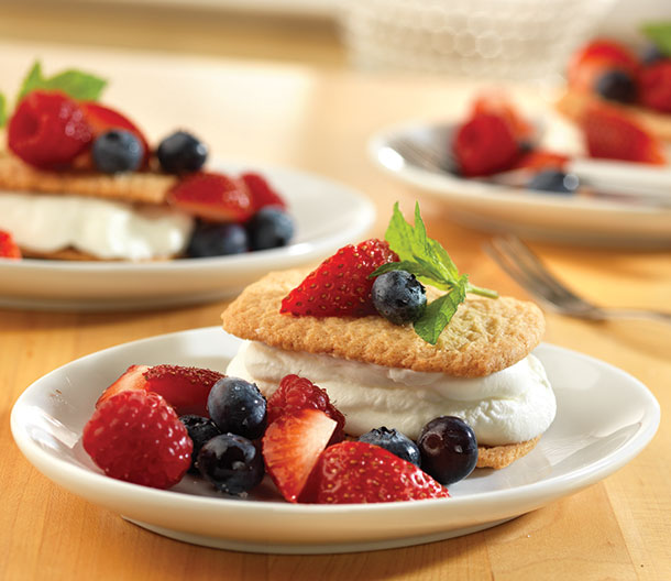 Rich butter cookies are layered with lightly sweetened whipped cream and garnished with a berry mixture for a trifle-inspired dessert.